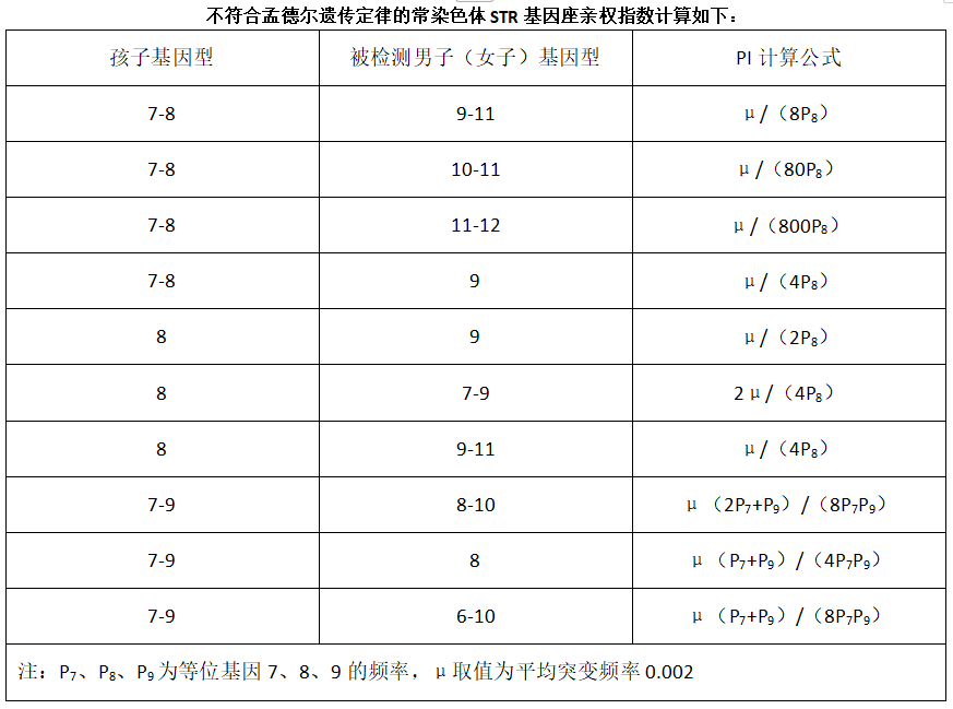 进行常染色体STR基因座检测时,用于二联体亲权鉴定的检测系统的累积排除概率(CPE)应不小于0.9999,不应根据一个遗传标记不符合遗传规律就作出排除亲权关系意见,不符合遗传规律的遗传标记应参与计算累积亲权指数。满足以上条件的基础上,在不考虑双胞胎或者近亲情况下,当累积亲权指数(CPI)小于0.0001时支持被检测男子(女子)不是孩子的生物学父(母)亲的假设,当亲权指数(CPI)大于10000时支持被检测男子(女子)是孩子的生物学父(母)亲假设。